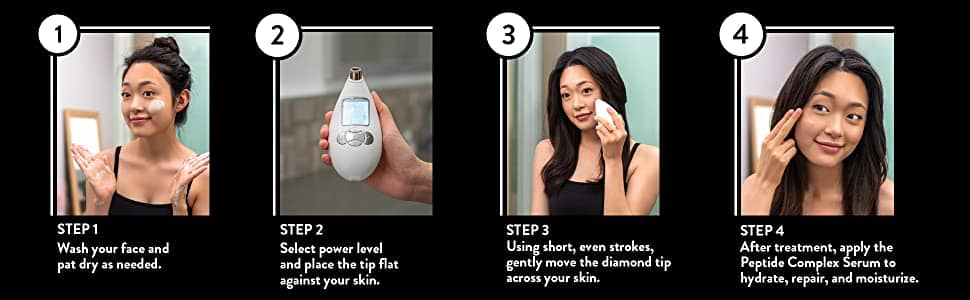 1. Wash your face and pat dry. 2. Brace the skin with your free hand and place the diamond tip flat against the skin. 3. Using short, even strokes, gently move the diamond tip across the skin, ensuring that the tip remains flush with skin. 4. After treatment, apply the Peptide Complex Serum to Hydrate, Repair, and Moisturize. For Best Results, Use the Facial Steamer SPA+ to deep clean your skin before treatments.